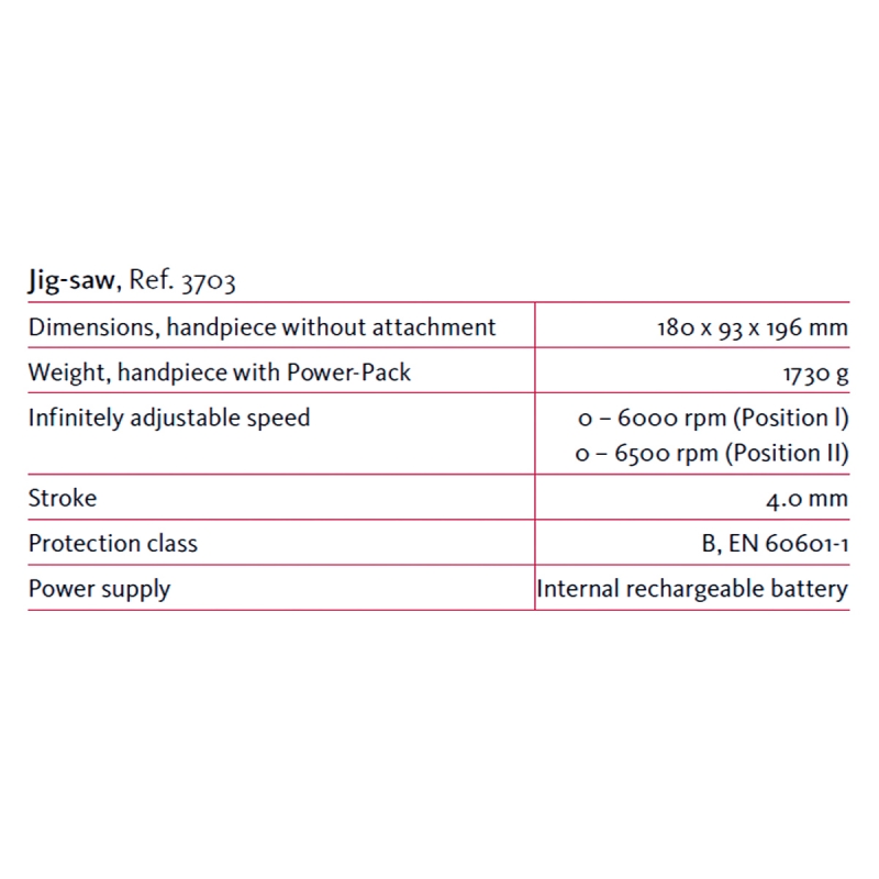 La sierra de calar se puede operar dentro de dos rangos de velocidad de 6'000 rpm o 6'500 rpm con una potente carrera de 4,0 mm.